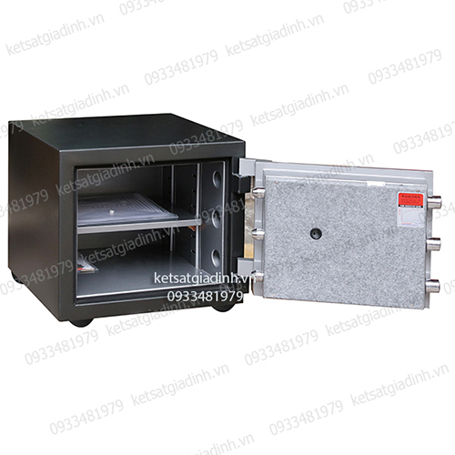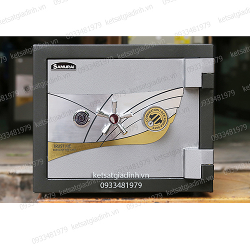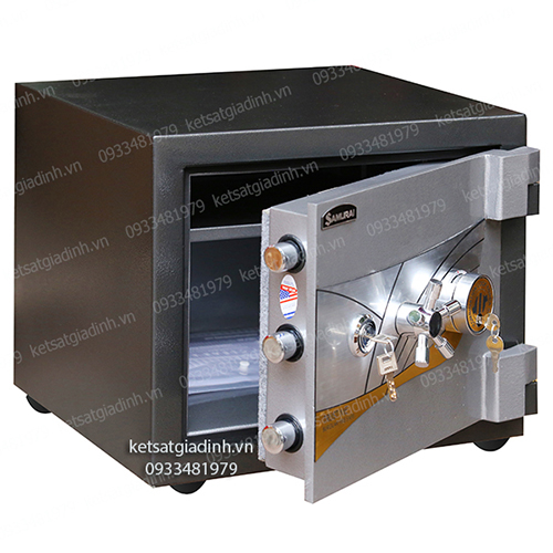 + Khả năng chống cháy: ~ 1050 độ C trong 120 phút. + Bảo hành tại nhà khách hàng 60 tháng kể từ ngày mua. + Xuất xứ: Việt Nam - Linh kiện Hàn Quốc. * Cấu tạo sản phẩm: + Thân két gồm 2 lớp thép mạ điện (GA) + đá + thép hạt và hỗn hợp chất cách nhiệt chịu được nhiệt độ cao, chống đục phá tốt. + Cánh cửa được làm từ thép Cacbon C45 theo tiêu chuẩn JIS Nhật Bản dày nguyên tấm 12mm ,là loại thép có độ cứng rất cao - chống cạy, chống khoan cắt. + Bên trong két có 01 đợt di động tùy chỉnh lên xuống. Để được cặp clear bag, giấy A4 + Hai bản lề ngoài thiết kế đặc chắc tạo góc mở 180 độ cho cánh cửa rất thuận tiện khi sử dụng. + Hệ thống chốt Inox liên hoàn xuyên sâu vào thân két khi đóng cửa - với 6 chốt Inox phi 32mm nhao 4 chiều vô cùng chắc chắn khi cửa đóng. + Két sắt Samurai được xử lý bề mặt bằng hóa chất, với loại sơn chống rỉ đặc biệt, có độ bám dính cao, có độ chống nước chống trầy. - Hệ thống khoá liên hoàn: Một khoá chìa Made in Korea, một tay nắm chấu xoay, một khoá số cơ có định vị chống xoay MY 8601 Madein Korea. + Chìa khóa 2 chế độ - khách hàng có thể tự lựa chọn chế độ sử dụng khóa chìa hoặc không cần khóa chìa. * Tính năng sản phẩm: - Chống cháy/chống nước/ chống cạy chống đục phá / chống khoan chống cắt - Khóa mã: