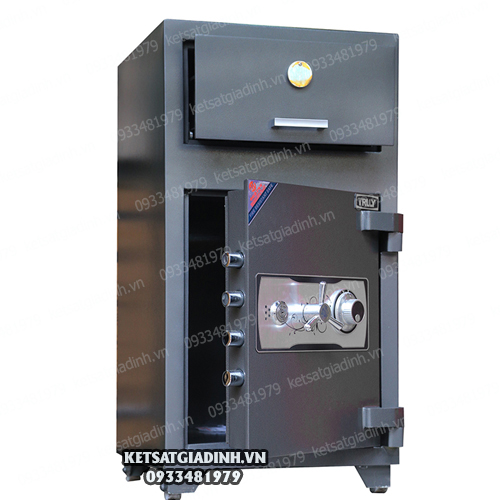 *Cánh cửa ngăn trên thép tấm dày 8mm. Thân két đúc đặc thép 2 lớp + vật liệu chống cháy chống phá cao cấp.