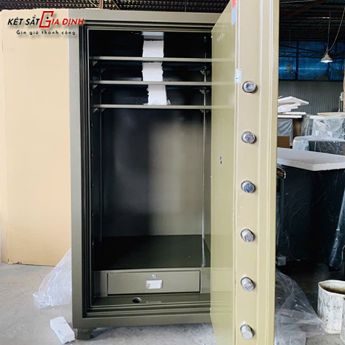 - Bên trong lòng két được thiết kế có đợt di động chia ngăn để giấy tờ và 1 hộc ngăn kéo có khóa chìa riêng.