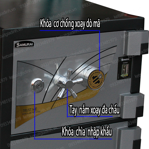 * Cấu tạo: + Thân két gồm 2 lớp thép mạ điện (GA) + đá + thép hạt và hỗn hợp chất cách nhiệt chịu được nhiệt độ cao, chống đục phá tốt. + Cánh cửa được làm từ thép Cacbon C45 theo tiêu chuẩn JIS Nhật Bản,là loại thép có độ cứng rất cao - kẻ gian sẽ không thể cạy hay phá nổi cánh cửa. + Bên trong két có 01 ngăn phụ có khóa + 01 đợt di động tùy chỉnh lên xuống. Để được cặp clear bag, giấy A4 + Hai bản lề ngoài thiết kế đặc chắc tạo góc mở 180 độ cho cánh cửa rất thuận tiện khi sử dụng. + Hệ thống chốt Inox liên hoàn xuyên sâu vào thân két khi đóng cửa - với 14 chốt Inox phi 32mm nhao 4 chiều vô cùng chắc chắn khi cửa đóng. + Két sắt Samurai được xử lý bề mặt bằng hóa chất, với loại sơn chống rỉ đặc biệt, có độ bám dính cao, có độ chống nước chống trầy. - Hệ thống khoá liên hoàn: Một khoá chìa Made in Korea, một tay nắm chấu xoay, một khoá số cơ có định vị chống xoay MY 8601 Madein Korea. + Chìa khóa 2 chế độ - khách hàng có thể tự lựa chọn chế độ sử dụng khóa chìa hoặc không cần khóa chìa. * Tính năng: - Chống cháy/chống nước/ chống cạy chống đục phá / chống khoan chống cắt - Khóa mã: + Khóa cơ có định vị chống xoay Made in Korea MY 8601 + Đặt được mã số tự chọn bảo mật với bộ mã 3 cặp số. * Cách mở két khóa cơ : + Cách mở: Mở khóa chìa xoay hết theo chiều kim đồng hồ + mở khóa mã (nhân viên giao hàng sẽ hướng dẫn tận tình cho khách hàng) + xoay tay nắm qua trái mở két. + Cách đóng két: cầm tay nắm đẩy đóng cửa và xoay qua phải+ xoay khóa chìa ngược kim đồng hồ + xoay xả mã số trái hơn 1 vòng và phải hơn 1 vòng . * Lưu ý: Quý khách nên dùng cả khóa chìa và mã số để độ bảo mật được cao nhất. * Sản phẩm gồm: thân két + 01 bộ khóa chìa chính + 01 bộ khóa chìa ngăn phụ + hướng dẫn sử dụng + bảo hành + phiếu giao hàng.